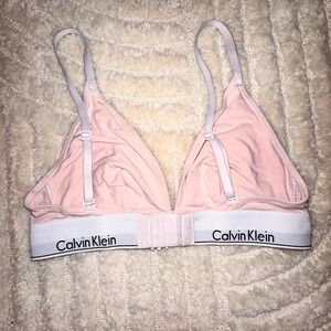 Calvin Klein bralette with clasp in back, and straps detach in back to criss cross, it is in pretty good condition and the cup is 53% cotton, 35% modal, and 12% elastane, and the band is 69% nylon, 23% polyester, and 8% elastane. It is a size medium and it runs a bit on the smaller side.
