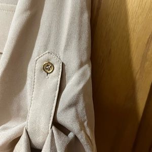 Size XL tunic-style shirt. Beige in colour with slight shimmer to the polyester fabric. Lace-up neck line has 6 gold eyelets and gold tipped lace with Calvin Klein logo stamped on them. Long sleeves can be worn down with buttoned cuff or as three quarter length with buttoned strap. Has 2 faux flap breast pockets. Back has fitted yolk and is free-hanging. Never worn but no tags.