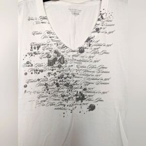 This Calvin Klein t-shirt features a striking black graphic design on a white background, offering a modern and artistic flair. The fitted style and short sleeves make it a versatile addition to any casual wardrobe. Crafted from a comfortable cotton blend, it's perfect for everyday wear.