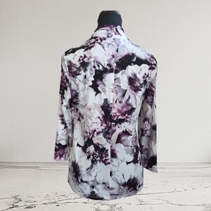 This elegant Calvin Klein blouse features a sophisticated ruched design in a striking white and purple color palette. The 3/4 sleeves and mandarin collar add a touch of modern flair, making it a versatile addition to any wardrobe. Perfect for both professional and casual settings, this blouse combines style and comfort effortlessly. Length 24" Bust 34" Sleeves 17"