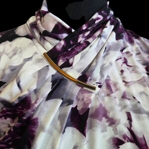 Calvin Klein White and Purple Ruched Blouse with 3/4 Sleeves And Gold Accent S