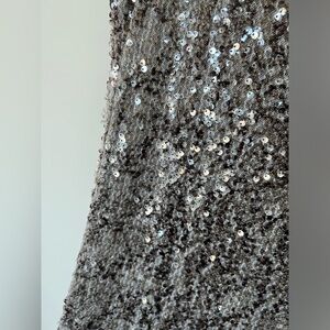 •Shine in this stunning silver sequin sleeveless dress. Perfect for any special occasion.