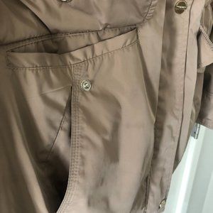 Women's full zip rain jacket with gold snap closures. Tan colour. Size small. Removable hood. Waist drawstring inside. Hood drawstring with gold accents. Small rip in seam of right underarm.