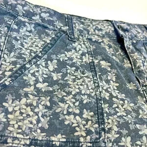 Made of cotton, so they're breathable and durable. Perfect four pocket construction so they offer function and style. A pretty shade of blue with the sweetest little flowers all over.