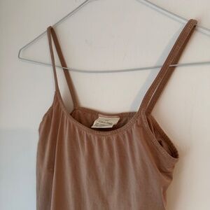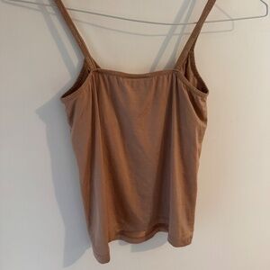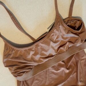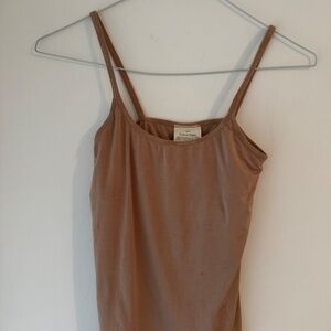 Calvin Klein Y2K 2000s tank top slip lined bra camisole shirt, size S small nude tan pink skin beige skin colored tanks shirts. From late 90s to millenium era, tops with spaghetti straps thin strap, smooth comfy fit has stretch fits women's size small or extra XS. 18% lycra elastane, 82% nylon, has shelf bra linked supportive built in soft bra underneath for support and coverage, cropped crop length top coverup underwear lingerie basics layering CK, everyday scoop neck shapewear shape wear lining invisibles loungewear cami bralette similar skims chemise .