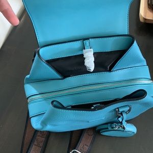 Blue backpack with brown two tone straps and silver hardware. Never used- packing in place.