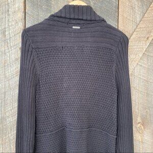 Calvin Klein 💯 cotton cardigan. Button closure. A mix of knit detailing. Fitted through to the waist. Flares out from the waist to the hips. Colour is black. Please note that there’s a small area at the cuff on one sleeve which has a bit of discolouration. Not very noticeable because of where it is. This cardigan is in good used condition. Size L but could fit medium also. See measurements below.