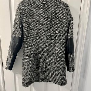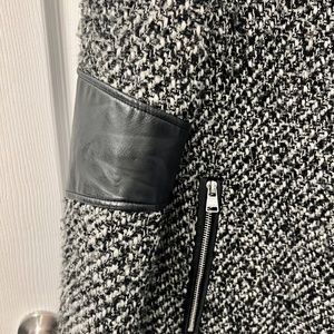 A classic white & black piece from Calvin Klein, this coat also has fun leather accents to keep you stylish and warm.