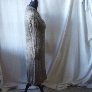 Calvin Klein long sleeved light brown sweater dress. Below the knee. Pull over. Usable buckle at the left waist. Unlined. Mock cowl neck. No pockets. 100% acrylic. It is marked as a small. There are not any stains, tears or holes. Very good, gently used condition.