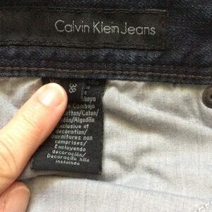 Calvin Klein Mens jeans. Dark wash skinny. Size 38. Inseam 32”. Width at cuff 8”. Like new, barely worn. Dark blue wash - photo in black is just to show fit.