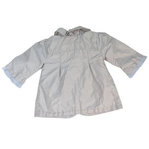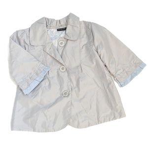 Calvin Klein Jeans girls size 2 jacket with denim skirt set. Jacket is soft grey with a very subtle sheen, dress shirt details at the cuffs, lined in white with blue print cotton. denim skirt has button and drawstring closures with built in shorts. In great pre owned condition.