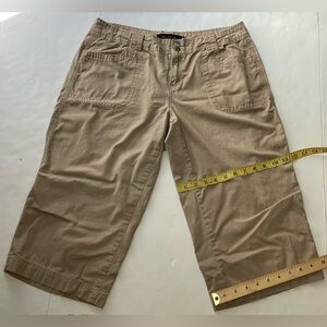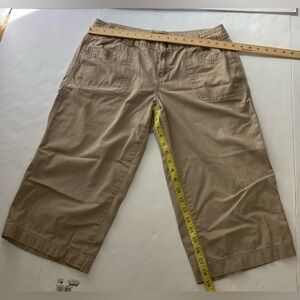 There is no attached fabric label but they feel like cotton. 2 front pockets and 2 snap back pockets. Zipper and snap closure. Preloved with some minor wear to upper seam of waistband (see pic). Otherwise in good condition