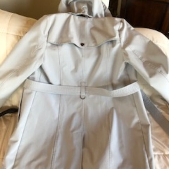 Self tie belt, slash pockets with welt, storm cape and epaulet, detachable hood, nice top stitching.