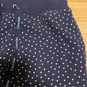 Good condition Calvin Klein PJ set in a size XS. Cozy cotton blend with terry cloth inside. Cute heart print on the bottoms. Some signs of wear but still in great shape with no damage. Clean and non smoking.