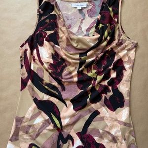 Calvin Klein size small. Lovely printed multi coloured sleeveless top. Features a draped neckline that is very flattering.