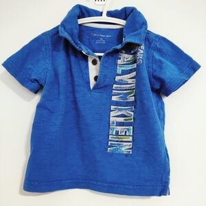 1 blue polo shirt with Calvin Klein Jeans logo written in capitals vertically and slits on both sides