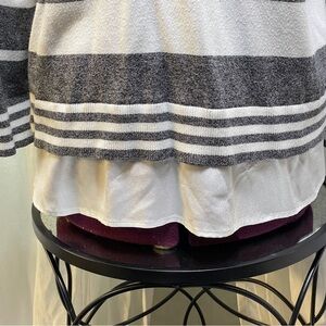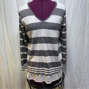 This pull over sweater with layered style look and black and white stripes micro knitted vneck size large