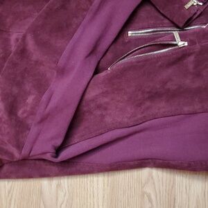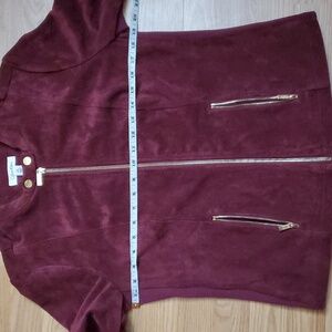 Burgundy/maroon faux suede jacket. Gold embellishments, zippered pockets, double top button. Jacket does have ribbed cotton panels on back of arms and at the sides to allow some stretch for a comfort fit.