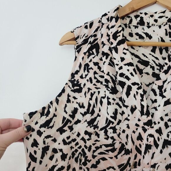Nice pleated v neck collar sleeveless blouse from Calvin Klein with an abstract animal print pattern. Excellent preloved condition no stains or tears or pil etc. Colors are off white, black, pale pink and taupe.