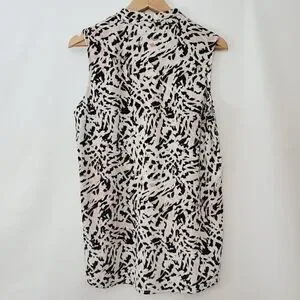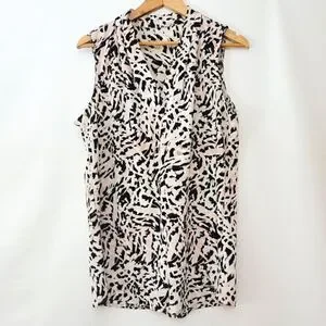 Nice pleated v neck collar sleeveless blouse from Calvin Klein with an abstract animal print pattern. Excellent preloved condition no stains or tears or pil etc. Colors are off white, black, pale pink and taupe.