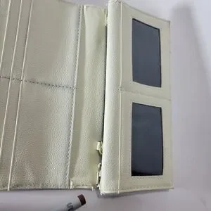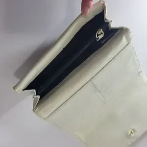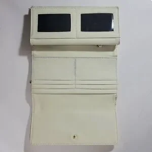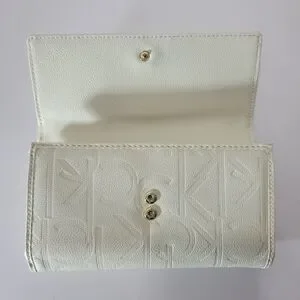 Fold out cream wallet with a "ck" cableknit embossed signature on the exterior. Tonnes of pockets inside for cards coins bills etc. Another zipper pocket for coins or smalls on the rear exterior. Clean black poly linings. Goldy brass tone front metal nameplate.