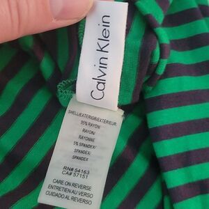 Giant super soft rayon jersey material dark navy and green stripes cowl/ infitity scarf from Calvin Klein. Excellent preloved condition no stains or tears, like new. Golden "Calvin Klein" signature print. It's a pretty big cowl but the material is not bulky so it makes for a nice loose textured fit. The cowl laid flat measures approximately 32 x 36". Very stretchy and slinky. Cool to the touch soft rayon fabric. 95 % rayon 5 % spandex.
