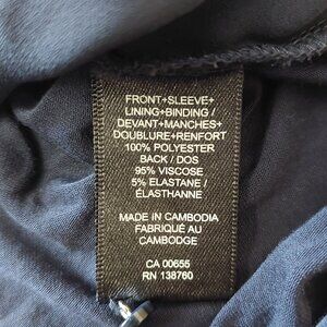 This previously owned top is in good used condition and features a scoop neck with subtle floral pattern on front and sleeves with a solid navy back with back button keyhole closure. Wonderful top for the workplace.