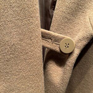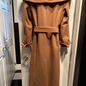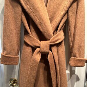 Size small women's camel hair wool coat. Beautiful camel colour, fully lined, 2 side pockets, wrap style with belt and back kick pleat. Midi length. Excellent condition.