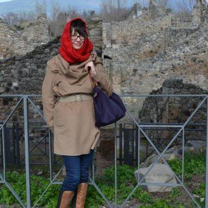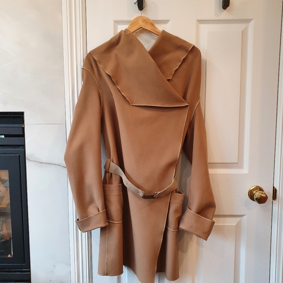 unique camel coat with beautiful draping. medium weight, perfect for spring or fall. very good condition, just some slight pilling on inside fabric. Bought in Ukraine from a young designer producing small batches of products. size small, but would fit a standard M