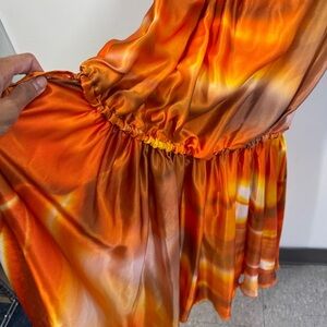orange satin evening gown, beaded formal maxi dress, Camelot designer dress, women’s cocktail party dress, bold orange formal gown, prom dress with beads, pageant dress size medium, mermaid hem satin gown, elegant evening wear, statement orange maxi dress, gala dress with beadwork, sleeveless satin occasion dress