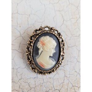 Vintage Cameo Brooch. Right Facing White Cameo on a Black background with Gold Tone Frame. Approximately 1 1/4 inch x 1 1/4 inch. Well made, in good condition Resin Cameo. Great accessory on a variety of pieces of clothing including hats, purses and coats!