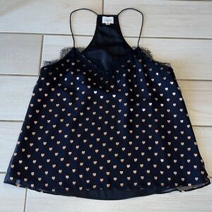 Chic black camisole with white heart pattern. Delicate lace trim. Perfect for layering or wearing alone.