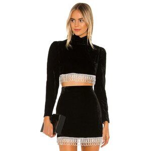 This stunning set includes three styles made of rich black velvet material, adorned with crystal embellishments on the trim. The Onika Skirt is a high-waisted mini embellished with hanging crystals that move when you do. Both the Jarissa Cropped Blazer and the Aliah Cropped Top match back to the Onika Skirt—the Jarissa Blazer featuring a cropped boxy fit while the Aliah Top featured a chic mock turtleneck with slightly puffed shoulder sleeves.