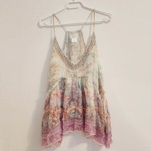 The Electron Libre Back Overlay Top is a fiercely feminine ode to the intricate pastel prints inside the chambers of Versailles. With whimsical lavender flourishes, this sumptuous silk top features an alluring curved hem, multiple layers of sweeping silk, delicate shoestring straps, as well as hand-placed crystals along the neckline.