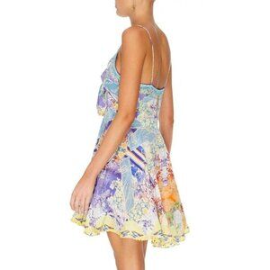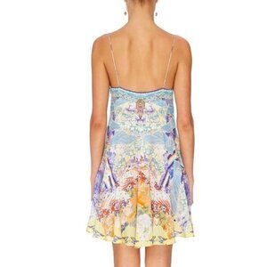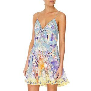 Lost with new friends in a realm where anything goes, the Girl In The Kimono Short Dress with Tie Front unveils a dreamy hand-painted print of Japan’s pastel posies and graceful peacock motifs. Handcrafted from sumptuous silk, this sensuous short-length dress features a bejewelled tie-front, dainty shoestring straps and a floaty full skirt made for moving to the gentle beats.
