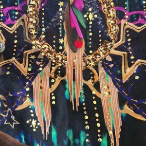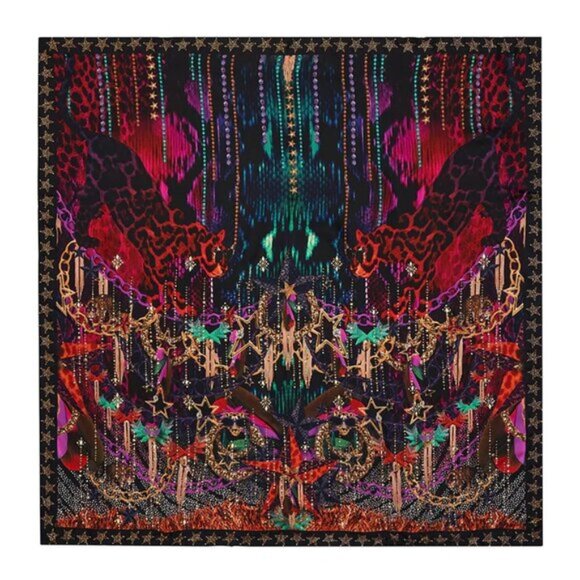 A vision in mahogany, the Rocket Woman Large Square Scarf is an ode to the glam rock goddesses who made the lavish eighties their own. Luscious silk is adorned with leopards, cascades of teal and starry scenes, golden chain details and subtle snake print upon a sea of ruby red. This luxury silk scarf features a generous square silhouette, a contrasting trim of celestial proportions and a multi-wear design. Wear it your way by adding it to your ponytail, transforming it into a summer blouse or wrapping it to your purse handle for added intrigue.