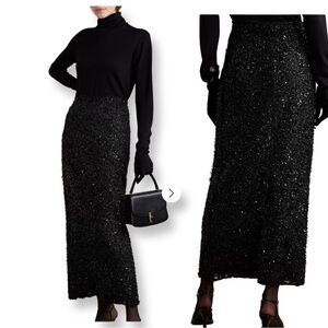 All-over sequin embellishment adds a dramatic touch to this Camille skirt. This is further enhanced by the piece's long length and on side slit detailing.