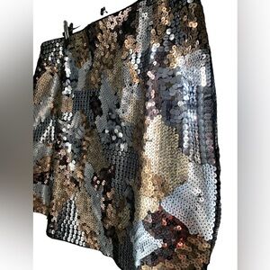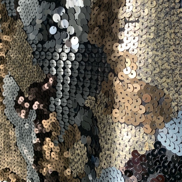 Sequins are in a camo pattern, in shades of silver, shiny/matte gold on a black background