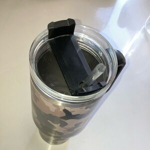 Stylish camouflage tumbler with a convenient handle. Perfect for on-the-go hydration.
