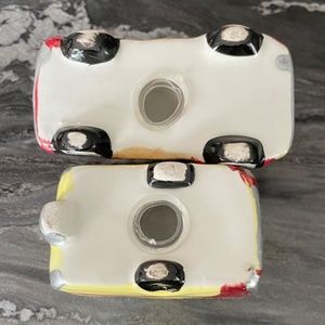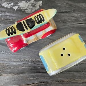 Ceramic 2 piece salt & pepper featuring car & biker camper