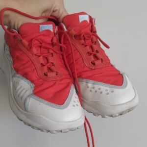 red/white leather contrasting panel detail round toe front lace-up fastening branded insole rubber sole POSITIVELY CONSCIOUS: The leather of this product has been produced in an audited and certified Leather Working Group tannery – scoring Bronze, Silver or Gold – so you can be confident you are choosing positively.