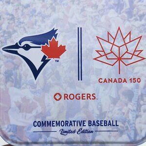 The baseball's design typically features the official Canada 150 logo, the Toronto Blue Jays team logo, and text commemorating the anniversary.