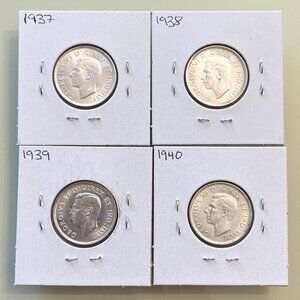 Canada 1937, 1938, 1939 and 1940 Silver 25 Cent Quarters!