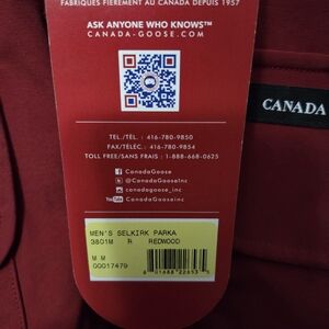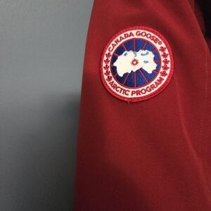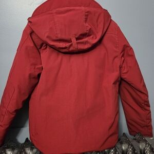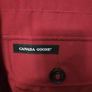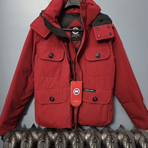Stylish red performance jacket by Canada Goose. Features multiple pockets and a hood. Ideal for outdoor activities.