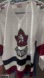 White hockey jersey featuring a red maple leaf patch with a hockey player design and 'Canada' text.