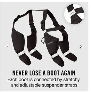 These boots provide secure paw protection and extended leg coverage. They’re adjustable and connected dog boots, which means you’ll never lose a boot. They’re also easy to layer with your favourite outerwear to stay clean and dry. All 4 dog boots are connected to each other.