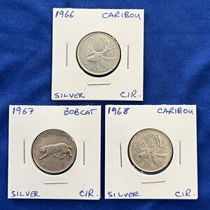 Explore the charm of Canadian numismatics with this set of 9 circulated silver 25¢ quarters, spanning from 1960 to 1968. Each coin is carrying with it a piece of history and the rich patina that time bestows. The collection showcases the craftsmanship of the era with its traditional composition and design, reflecting Canada's heritage and cultural narrative. These quarters are a tribute to the era of silver coinage in Canada, offering both collectors and enthusiasts a tangible slice of the past. As a group, they represent a notable period in Canadian history, making this set a significant addition to any collection or a thoughtful gift for those fascinated by the evolution of Canadian currency.