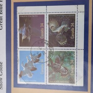 Collection of bird stamps featuring Great Horned Owl, Spruce Grouse, Snow Goose, and Great Blue Heron. Vibrant colors and detailed designs.