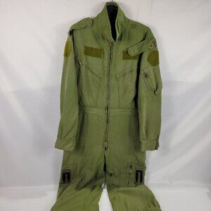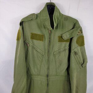 Olive green Canadian military coveralls flight suit, looks to be a size large, in good used shape as shown. Measurements are: pit to pit 22", waist 19", sleeve length is 24.5" and inseam is 30".
