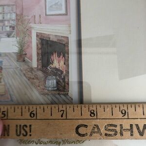 Lovely watercolour art print in a gold frame. Titled: Hearthside Afternoon. Features a woman reading a book lounging on a couch and a cat on the back of the opposite couch and a fire blazing in the hearth.